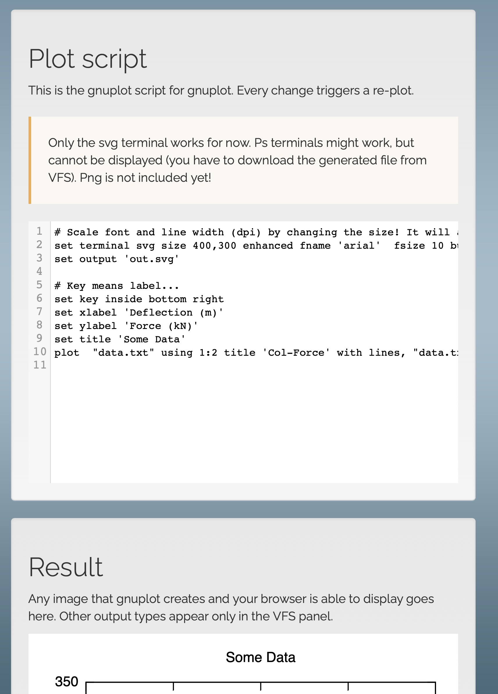 - 5行目「# Key means label...」以下は消して, 自分のグラフを描くためのコマンドを打ち込む. 下図では, 講義資料の2ページ目に記述されている例を"Plot script"に打ち込んだものを示す.