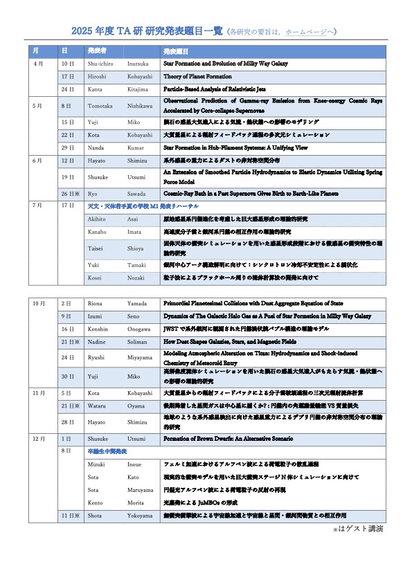 研)では、 基礎物理学に基づきスーパー・コンピュータを用いた数値計算や高度に解析的手法を用いて、宇宙の謎を明らかにしていきます。 特に現在は、種々の天体の形成過程について精力的に研究しています。そのために必要であれば物理学のあらゆる分野の理論を駆使し、計算に必要な手法・アルゴリズムの研究も行います。 従って、物理学やその他の科学の幅広い分野への興味を持って研究できる野心的な学生を期待しています。